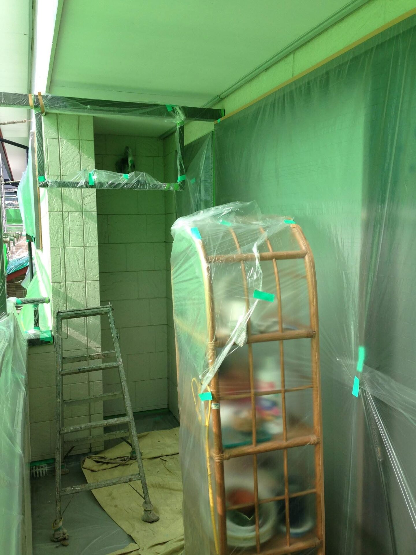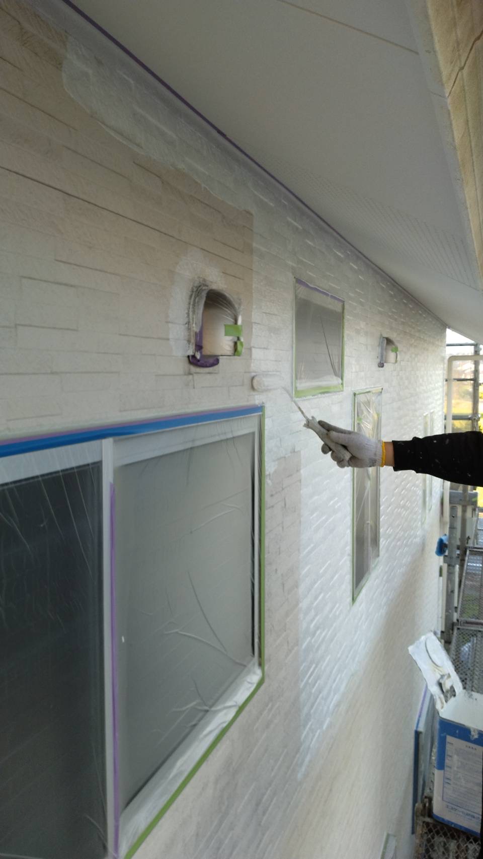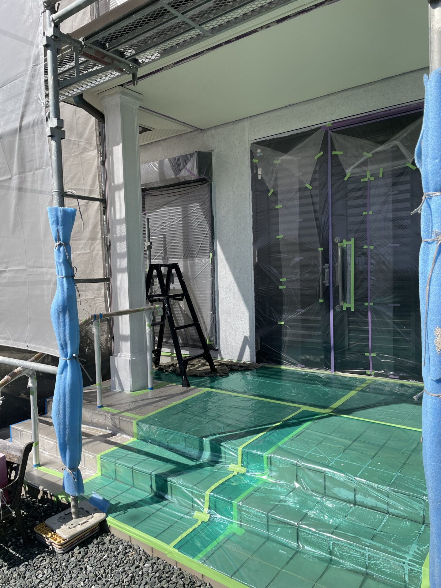 窓や玄関など、塗料が付かないようしっかり保護します。